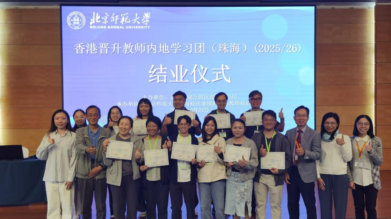 2025年10月21日至24日,由香港特别行政区政府教育局主办、北京师范大学珠海校区继续教育与教师培训学院承办的香港晋升教师内地学习团在珠海开展为期四天的深度研修活动。本次活动通过专业理论研修、内地学校参访、科技企业探秘与历史文化考察等多元形式,助力120位香港中小学晋升教师夯实教育创新能力,深化国家文化认知。