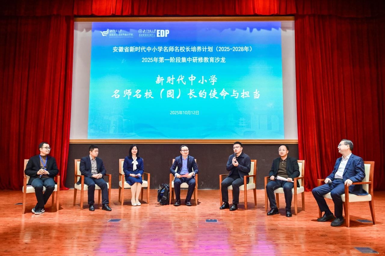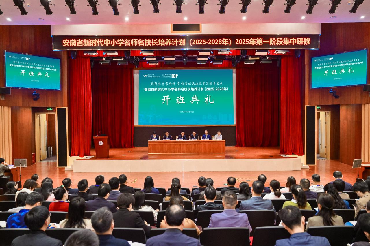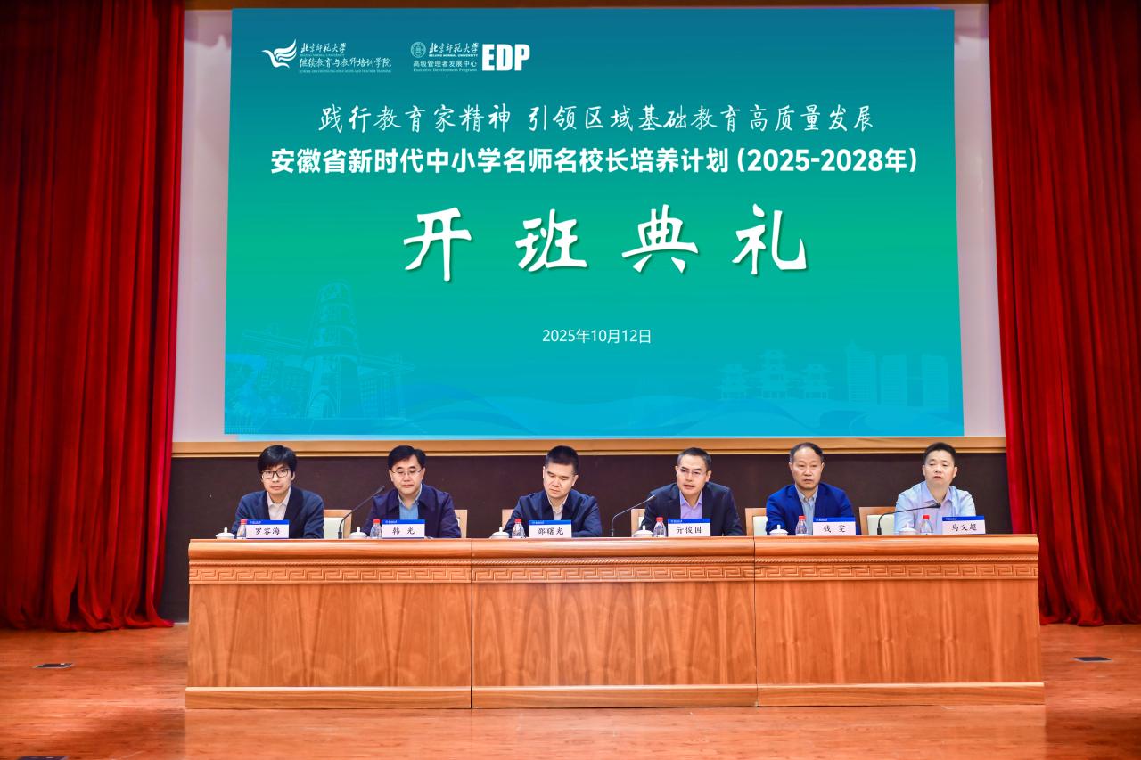 2025年10月12日,安徽省新时代中小学名师名校长培养计划(2025-2028年)开班典礼暨教育论坛在北京师范大学昌平校园举行。安徽省委教育工委委员、安徽省教育厅总督学邵曙光,安徽省教育厅师资处副处长、二级调研员韩光,安徽省中小学教师继续教育中心主任钱雯,安徽省教育厅师资处四级调研员马义超;北京师范大学继续教育与教师培训学院院长亓俊国、副院长罗容海,以及安徽省各地区参训的名师名校长培养对象200余人参加了开班典礼。开班典礼由韩光主持。