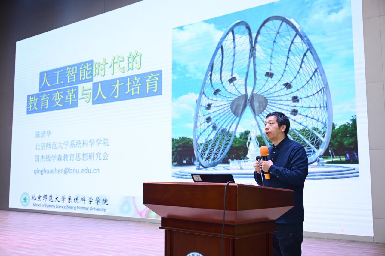 主旨报告和主题对话环节由北京师范大学继续教育与教师培训学院EDP中心主任秦晓虹主持。陈清华教授作主旨报告《人工智能时代的教育变革与人才培育》。国家督学、北京市首批特级校长刘国雄主持了以“人工智能时代的教育教学创新——名师名校长的实践与反思”为主题的对话交流活动。专家陈清华教授,“双名计划”名校长班学员汤滢,名师班学员卢适、朱蕾、张伟作为嘉宾参加了对话交流,围绕人工智能时代以学生为中心的教育教学方式变革、一线教育工作者的困惑与面临的挑战等问题展开了分享和交流。