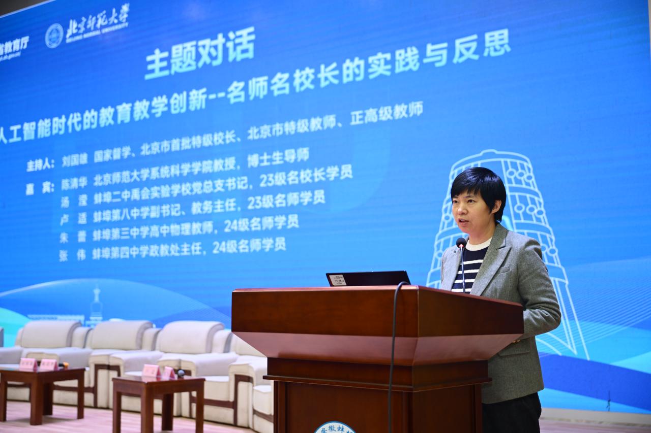 北京师范大学继续教育与教师培训学院党委副书记胡志峰在讲话中表示,北京师范大学作为安徽省“双名计划”的培养基地,始终秉持服务区域基础教育生态建设的战略思维,充分发挥高等教育龙头与基础教育基点的双重作用。通过“顶层设计-资源整合-实践转化”的实施路径,有效推动了区域高素质教师队伍建设,省校合作的名师名校长培养模式已取得良好成效。她指出,项目通过系统化培养,不仅促进了学员个体的卓越发展,更实现了从“输血”到“造血”的关键转变,并期望当地名师名校长培养对象能立足教育数字化转型的高地,将前沿理念与地方实践深度融合,开创更具引领性的教育实践。